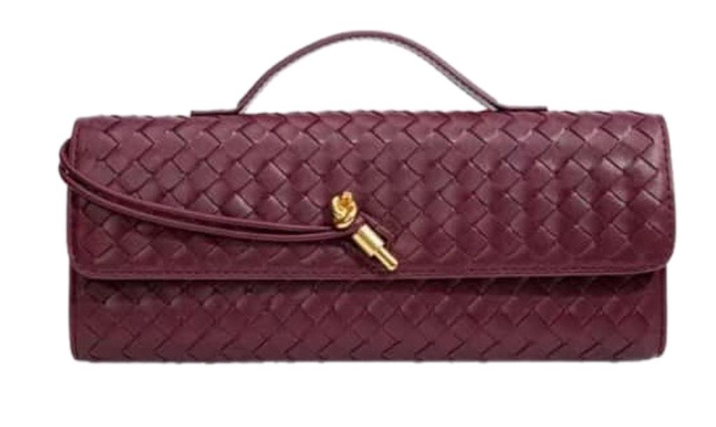 An elegant burgundy clutch with a stylish woven leather finish, gold-tone hardware, and a sleek top handle—perfect for evening events or refined occasions.