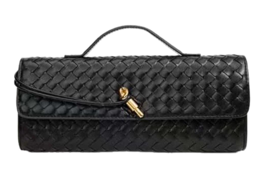 This elegant clutch showcases a rich coffee color and a handwoven leather design that adds timeless texture. Finished with a slim top handle and gold-tone twist detail, it’s the perfect blend of classic craftsmanship and modern style. £20 1pc