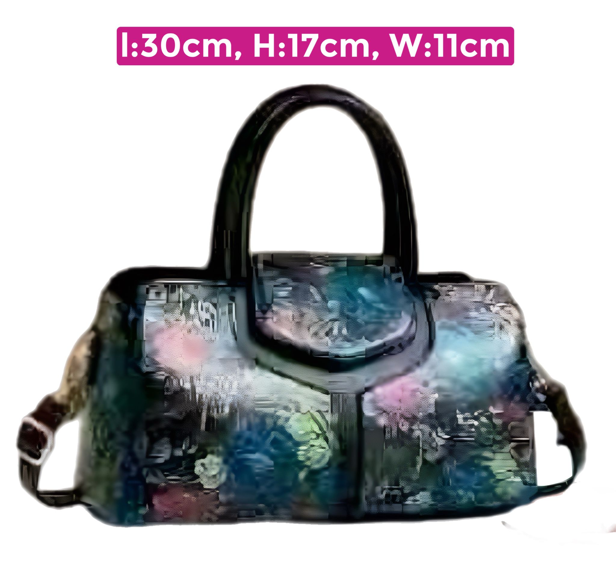 Elevate your style with this chic medium-sized handbag featuring a dark base with an artistic floral pattern in blue, pink, green, and lavender tones. Designed with sturdy top handles and side straps for versatile carry. Perfectly sized for your daily essentials.